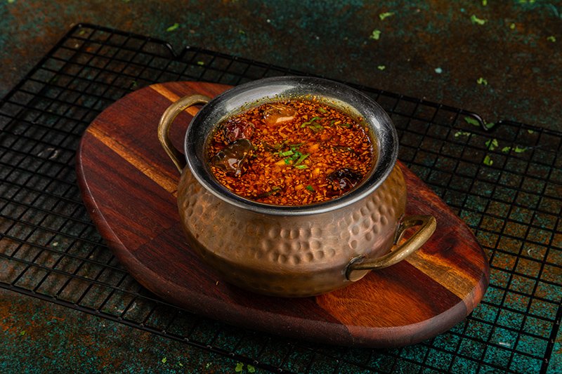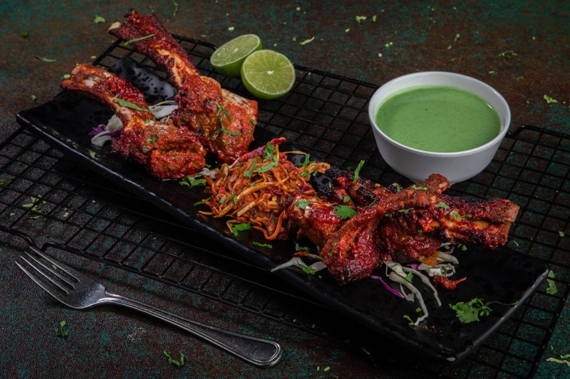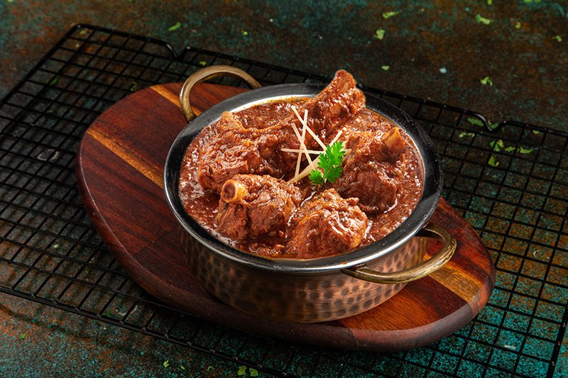 ساق كاملة من لحم الضأن متبلة طوال الليل مع مكونات الشيف الخاصة المطبوخة في فرن فخاري وتنتهي في تاوا مع مرق الشاهي الخاص محلي الصنع