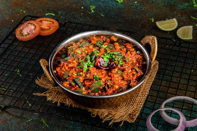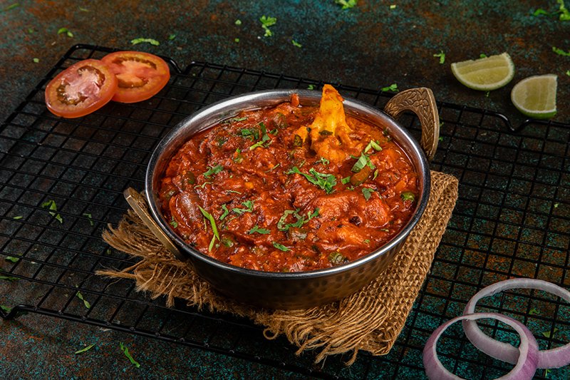 توابل هندية حارة تقدم مع البصل المفروم والطماطم