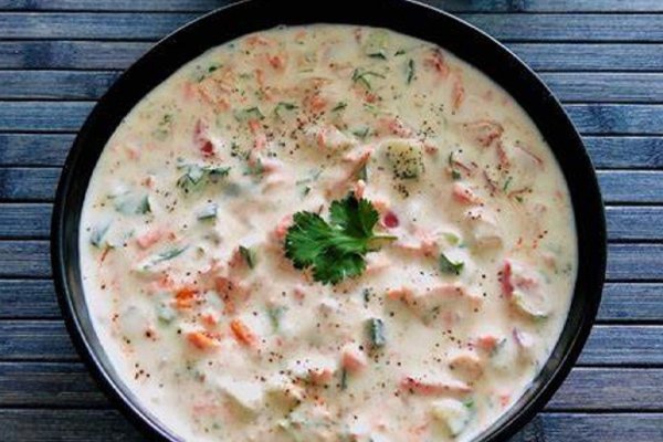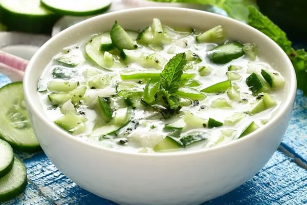 Onion, tomato and cucumber are dressed in natural yogurt & garnished with coriander leaves